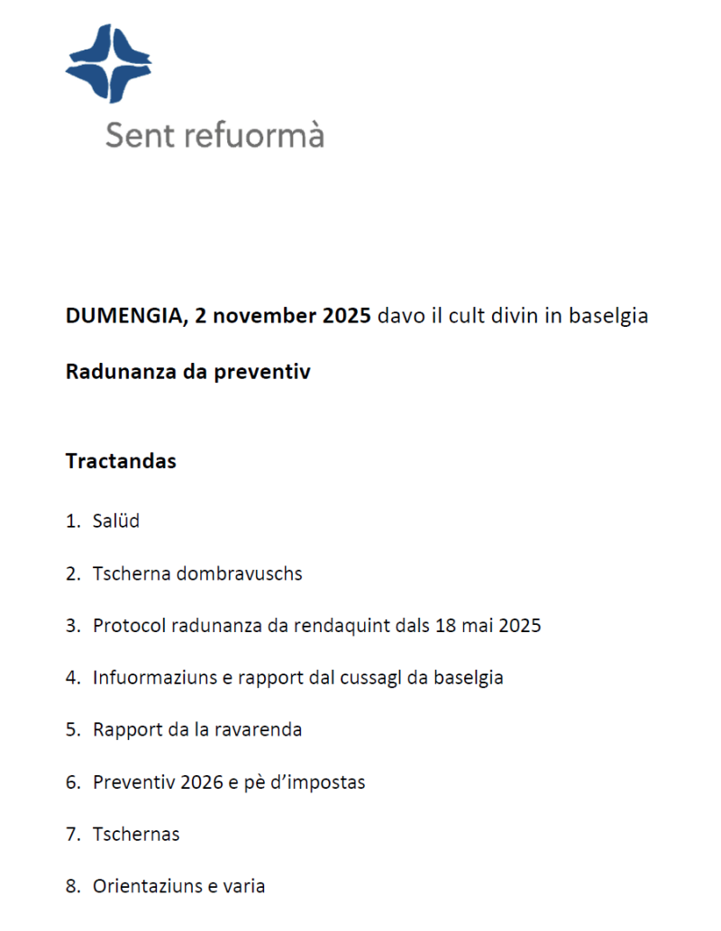 Plü aval stan l'invid culla glista da tractandas, il preventiv 2026 e'l protocol da la radunanza da rendaquint in mai a disposiziun per chargiar giò.
